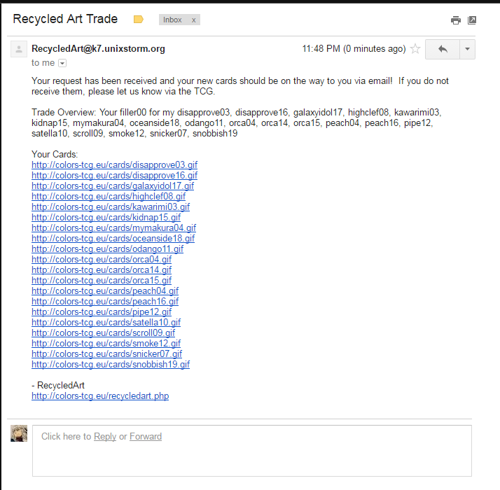 | +20 | Recycled Art | Disapprove03 | Disapprove16 | Galaxyidol17 | Highclef08 | Kawarimi03 | Kidnap15 | Mymakura04 | Oceanside18 | Odango11 | Orca04 | Orca14 | Orca15 | Peach04 | Peach16 | Pipe12 | Satella10 | Scroll09 | Smoke12 | Snicker07 | Snobbish18 | | Colors TCG | LINK |