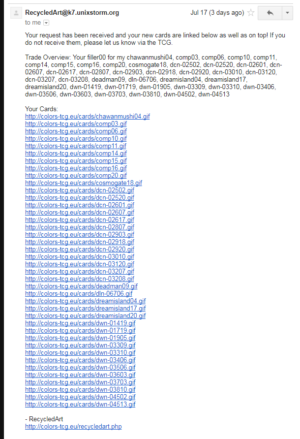 | +40 | Recycled Art | Chawanmushi04 | Comp03 | Comp06 | Comp10 | Comp11 | Comp14 | Comp15 | Comp16 | Comp20 | Cosmogate18 | Dcn-02502 | Dcn-02520 | Dcn-02601 | Dcn-02607 | Dcn-02617 | Dcn-02807 | Dcn-02903 | Dcn-02918 | Dcn-02920 | Dcn-03010 | Dcn-03120 | Dcn-03207 | Dcn-03208 | Deadman09 | Dln-06706 | Dreamisland04 | Dreamisland17 | Dreamisland20 | Dwn-01419 | Dwn-01719 | Dwn-01905 | Dwn-03309 | Dwn-03310 | Dwn-03406 | Dwn-03506 | Dwn-03603 | Dwn-03703 | Dwn-03810 | Dwn-04502 | Dwn-04513 | | Colors TCG | LINK |